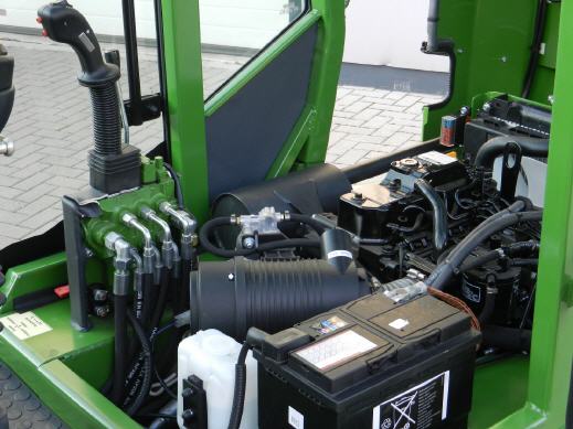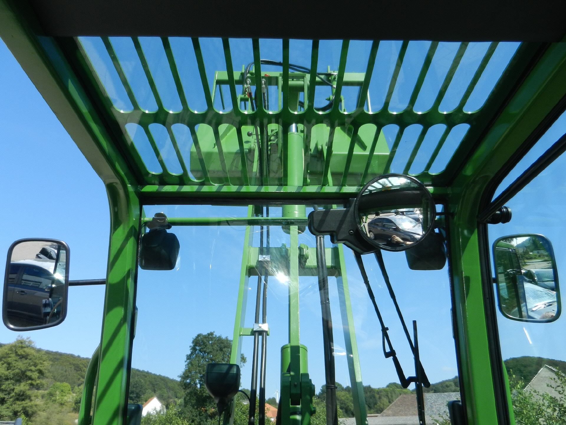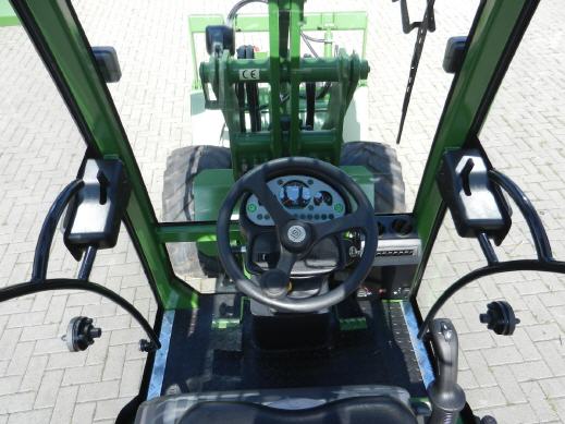 Besonders großen Wert wurde auf eine perfekte Rundumsicht gelegt. Auch bei voll ausgehobener Schwinge ist die Sicht auf die Arbeitsgeräte sehr gut. Das getönte Sicherheitsglas verhindert wirkungsvoll ein zu starkes Aufheizen der Kabine bei starker Sonneneinstrahlung. Der extra breite Einstieg wurde für häufiges Auf und Absteigen konzipiert. Die Ergonomie lässt keine Wünsche offen, alle Bedienelemente sind da wo man sie erwartet. Die beiden großen weit geöffneten Glastüren lassen sich auch in geöffneter Stellung sicher arretieren, sodass man bei Bedarf auch mit vollständig geöffneten Türen fahren und arbeiten kann. Auch an eine einfache Wartung aller Aggregate wurde gedacht, so sind Motor, alle Filter, Ölpeilstab, Kühler, Einfüllstutzen,usw., nach aufklappen der Haube bestens zu erreichen.